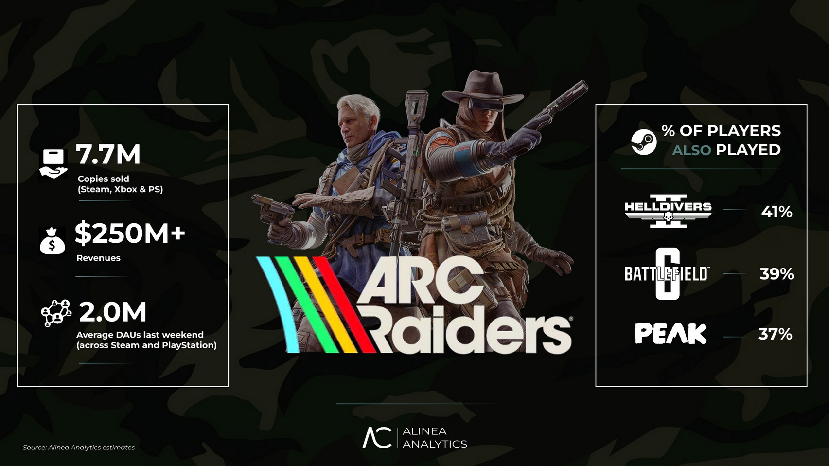 Alinea Analytics, Arc Raiders’ın 16-22 Kasım haftasında yaklaşık 750 bin kopya sattığını söylüyor. Toplam satışlar ise, 7.7 milyona ulaştı ve satışların en az yarısı Steam üzerinden gerçekleşirken, kalan bölümün ise PS5 ve Xbox Series X/S tarafına ait. Kasım ayı Steam listelerinde ARC Raiders’ın arkasında ise bağımsız yapımlar yer aldı.