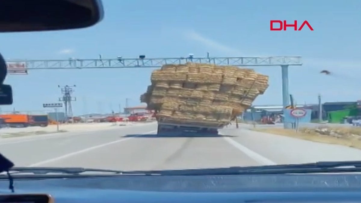 Eskil ilçesinde aşırı yüklü saman balyası taşıyan kamyonun tehlikeli yolculuğu çevredekiler tarafından cep telefonu kamerasına kaydedildi.