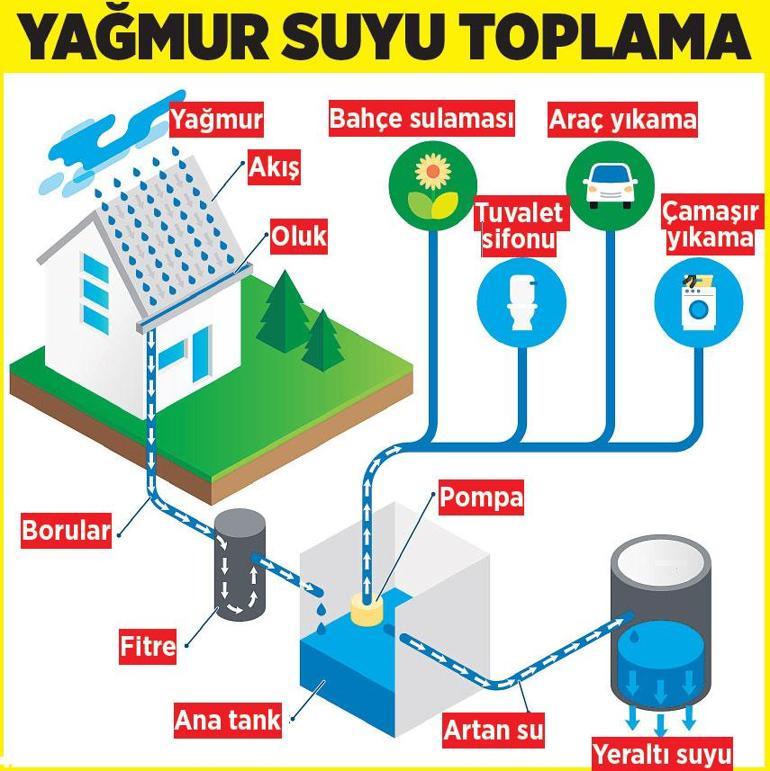 ■ Yağmur suyu, bahçe ve tuvalet rezervuarlarında kullanılacak. Yağmur suyu sistemi, deposu 7 metreküpün üzerinde olan parsel alanı 2 bin metrekareden büyük alanlardaki yapılar, parseldeki çatı izdüşüm alanı 1000 metrekareden büyük yapılar ve kamu binalarında zorunlu olacak. Bu sayede binalarda yıllık 6.2 milyon metreküp su tasarrufu sağlanacağı öngörülüyor.