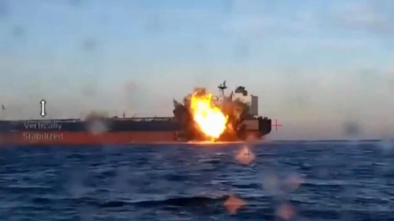 Konuya ilişkin paylaşılan görüntülerde, insansız deniz araçlarıyla gemilere saldırı düzenlendiği ve patlamaların yaşandığı görülüyor.