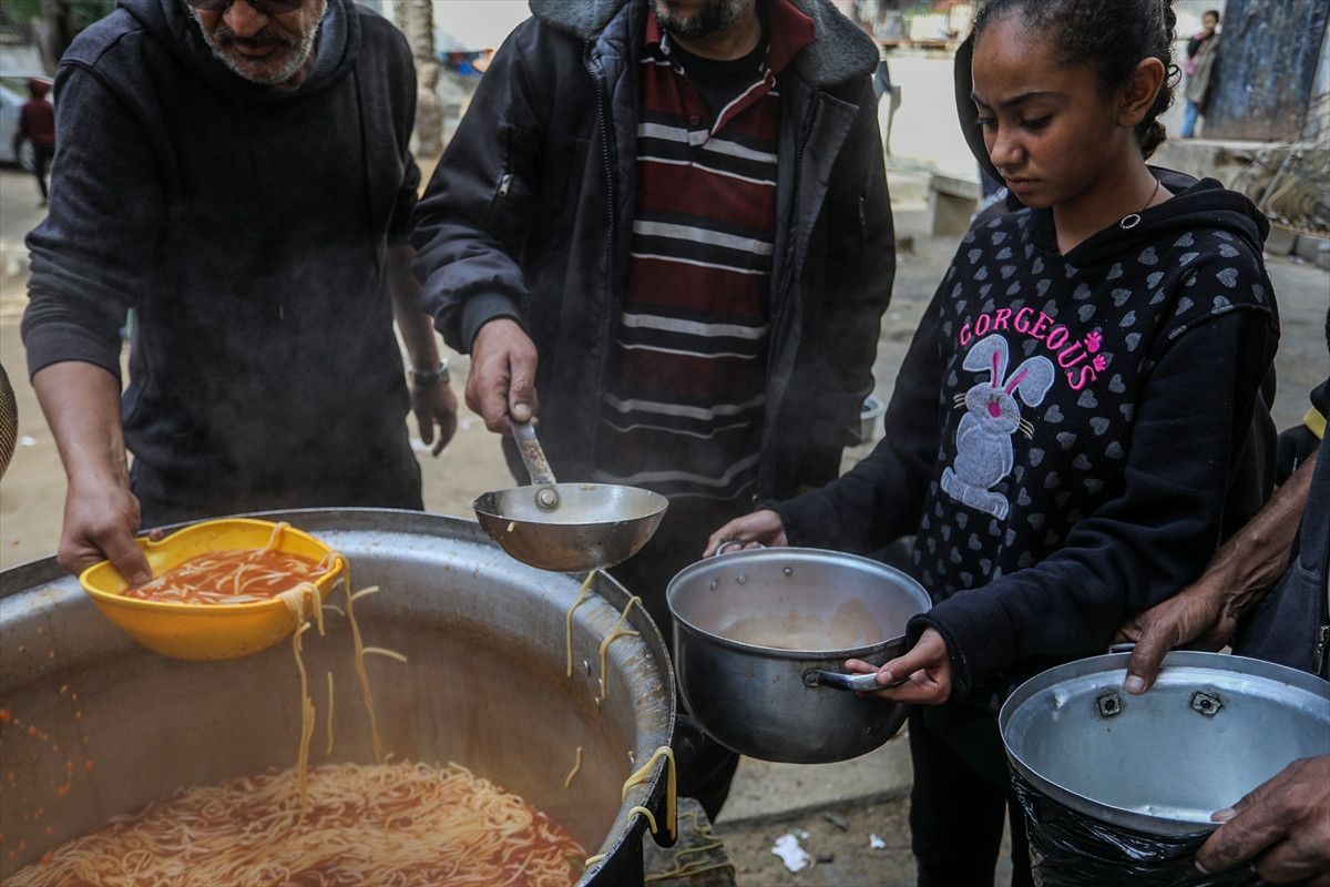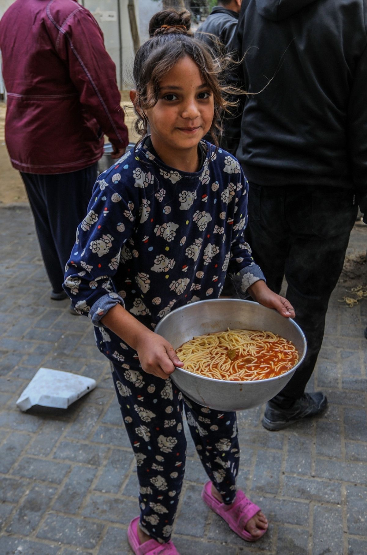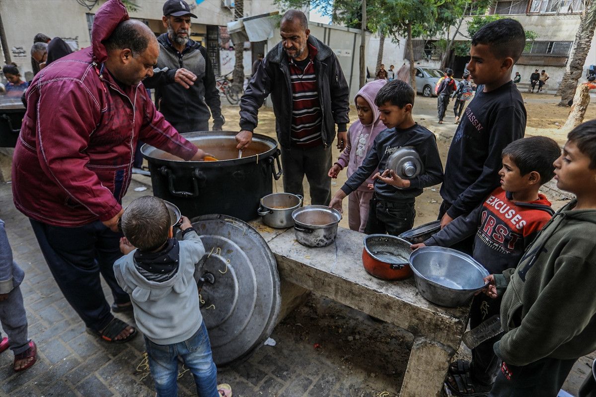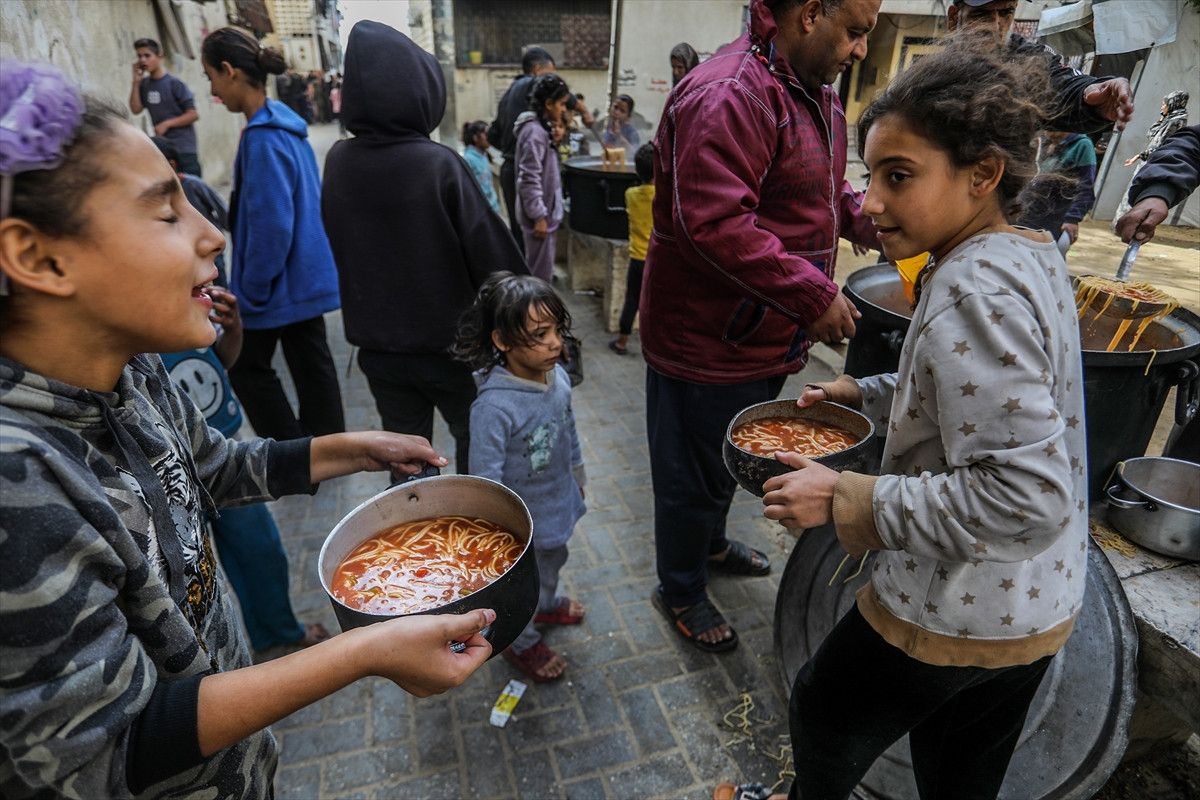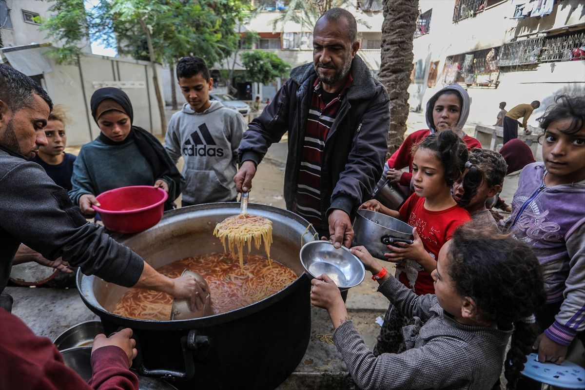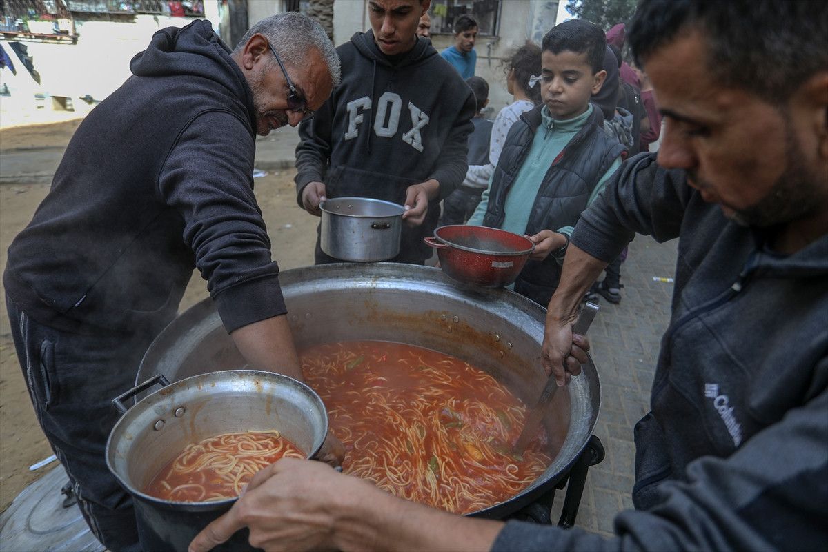 Gazze Şeridi’nin güneyinde bulunan Han Yunus kentindeki el-Mevasi bölgesinde, bir hayır kurumu tarafından İsrail saldırıları sonucu yerinden edilmiş Filistinlilere sıcak yemek dağıtımı yapıldı.