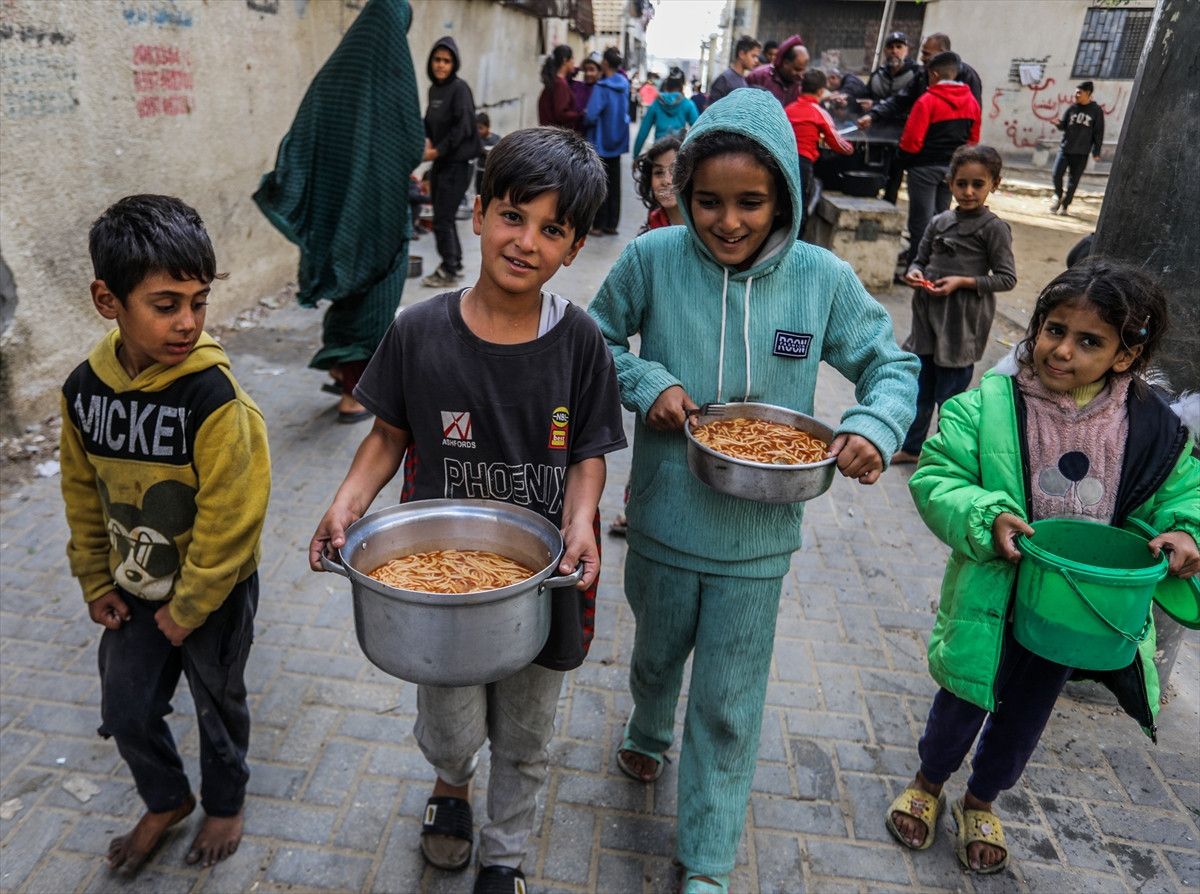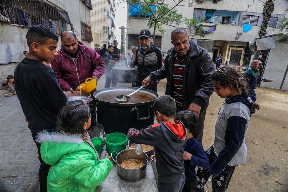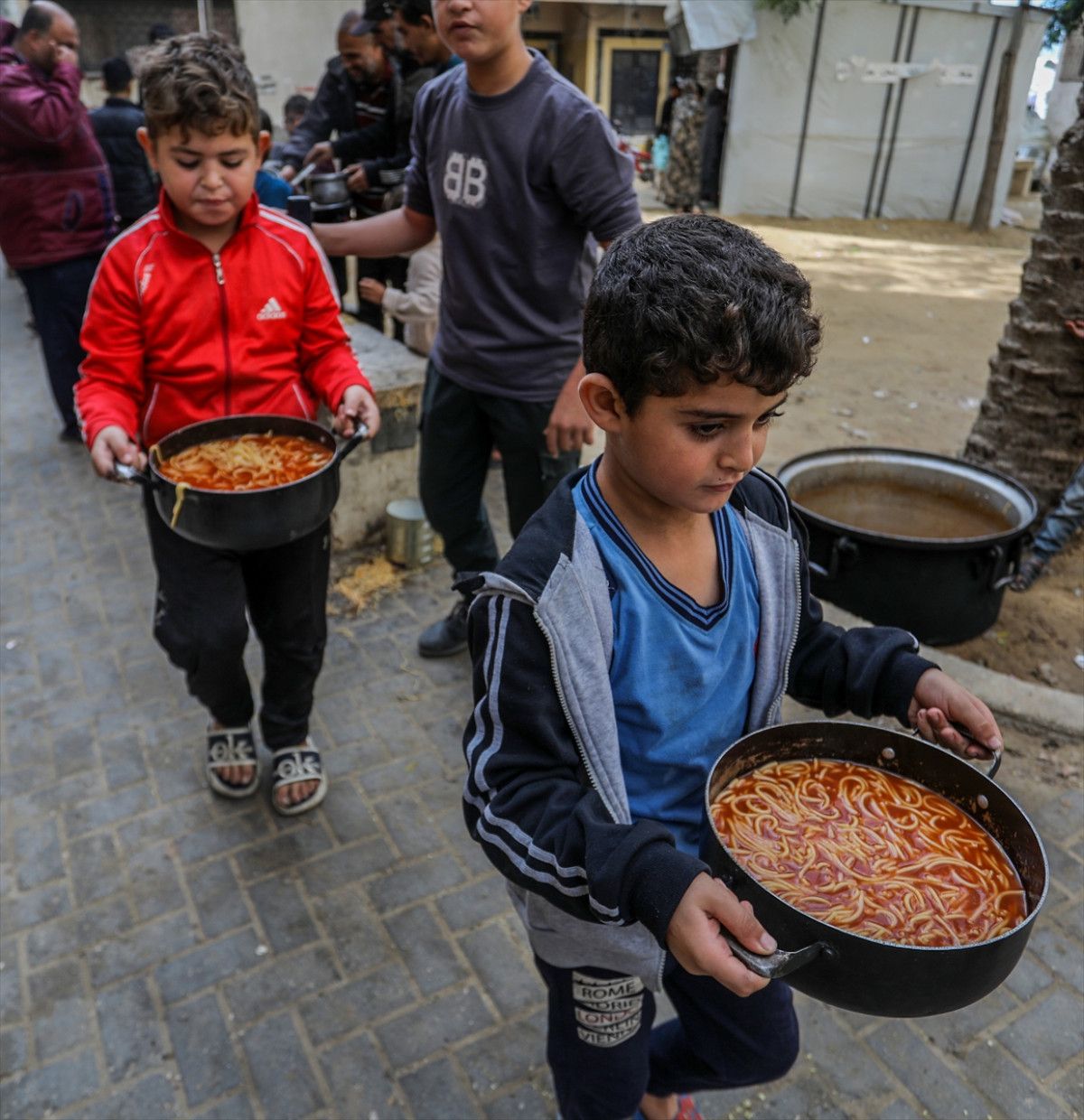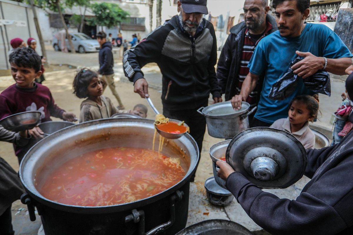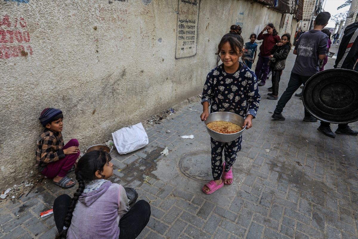 Gazze Şeridi’nin güneyinde bulunan Han Yunus kentindeki el-Mevasi bölgesinde, bir hayır kurumu tarafından İsrail saldırıları sonucu yerinden edilmiş Filistinlilere sıcak yemek dağıtımı yapıldı.