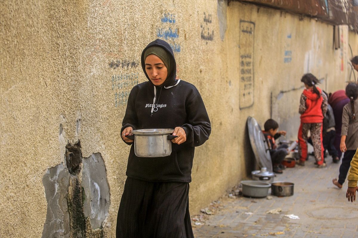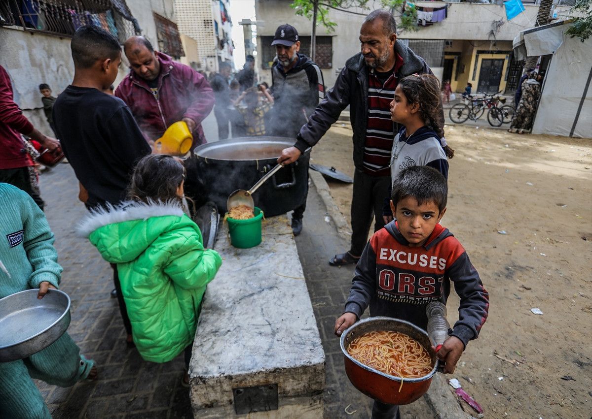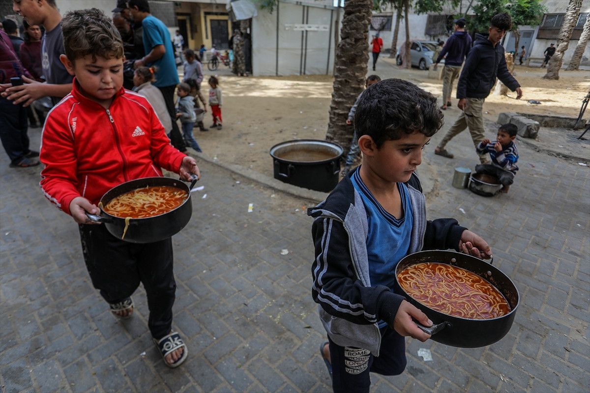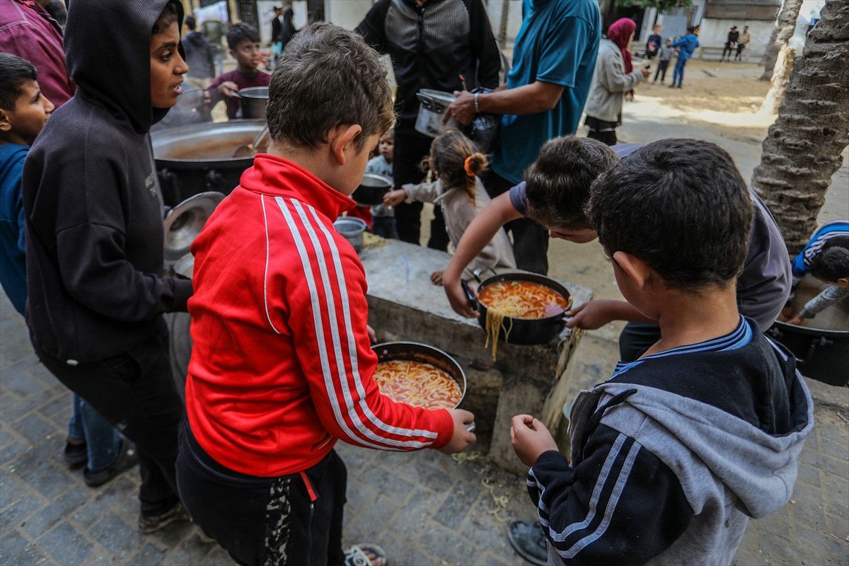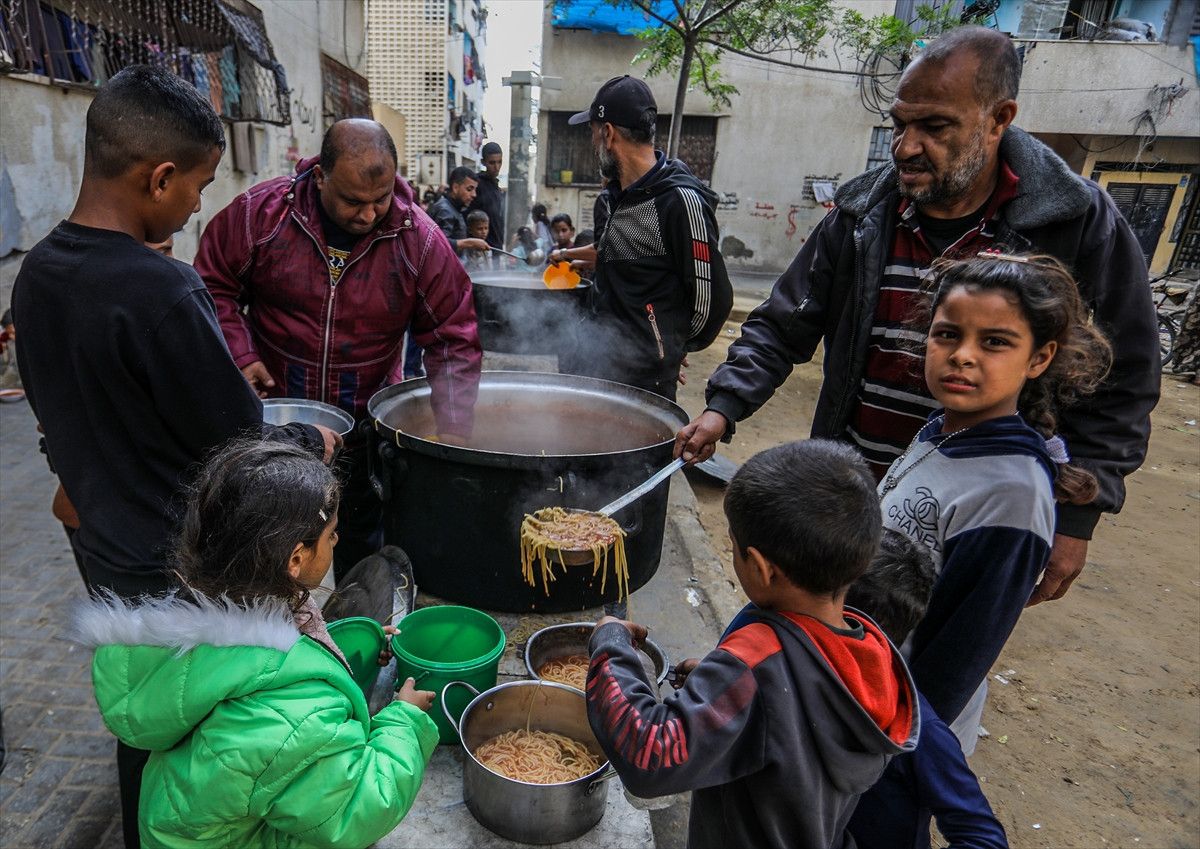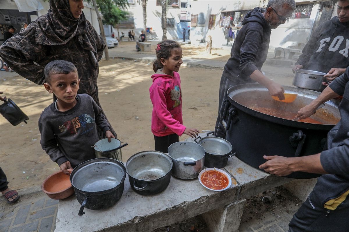 Gazze Şeridi’nin güneyinde bulunan Han Yunus kentindeki el-Mevasi bölgesinde, bir hayır kurumu tarafından İsrail saldırıları sonucu yerinden edilmiş Filistinlilere sıcak yemek dağıtımı yapıldı.