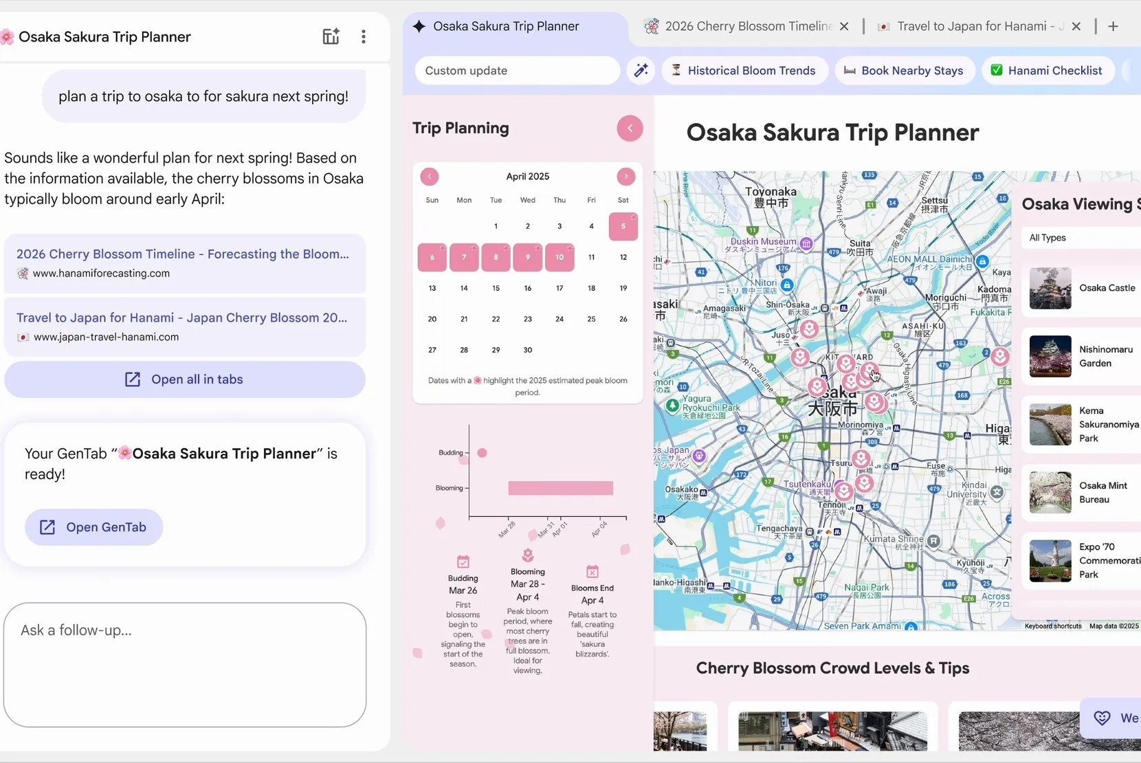 Disco, yalnızca metin ve bağlantı oluşturmak yerine iki şey yaptı: Roy’un isteğiyle ilgili bir dizi sekme açtı ve onun için etkileşimli bir planlayıcı oluşturmayı teklif etti. Roy teklifi kabul ettiğinde bir dakika kadar süren bir işlem sonucunda, Gemini küçük bir web uygulamasına benzeyen bir arayüz oluşturdu. Japonya haritası üzerinde önemli noktalar işaretlenmişti, basit bir gezi planlayıcısı vardı ve yararlanılan kaynaklara bağlantılar eklenmişti. Bu kaynaklar, projenin içinde açık olan sekmeleri de içeriyordu. Roy geziye eklemek istediği başka şeyler için yeni sekmeler açtıkça, GenTab bu yeni bilgileri de uygulamaya işledi. Bu çift yönlü etkileşim, konseptin merkezinde yer alıyor. GenTab öneriler sunuyor ancak kullanıcının kendi açtığı siteleri de dikkate alıyor. Yani modelden sürekli yeni şeyler üretmesini beklemek yerine, kullanıcı kendi araştırmasını da sürece katıyor. Japonya’da gidilecek yerleri sekmeler halinde açınca, GenTab bunları hem plana ekliyor hem de kendi önerileriyle birleştiriyor.