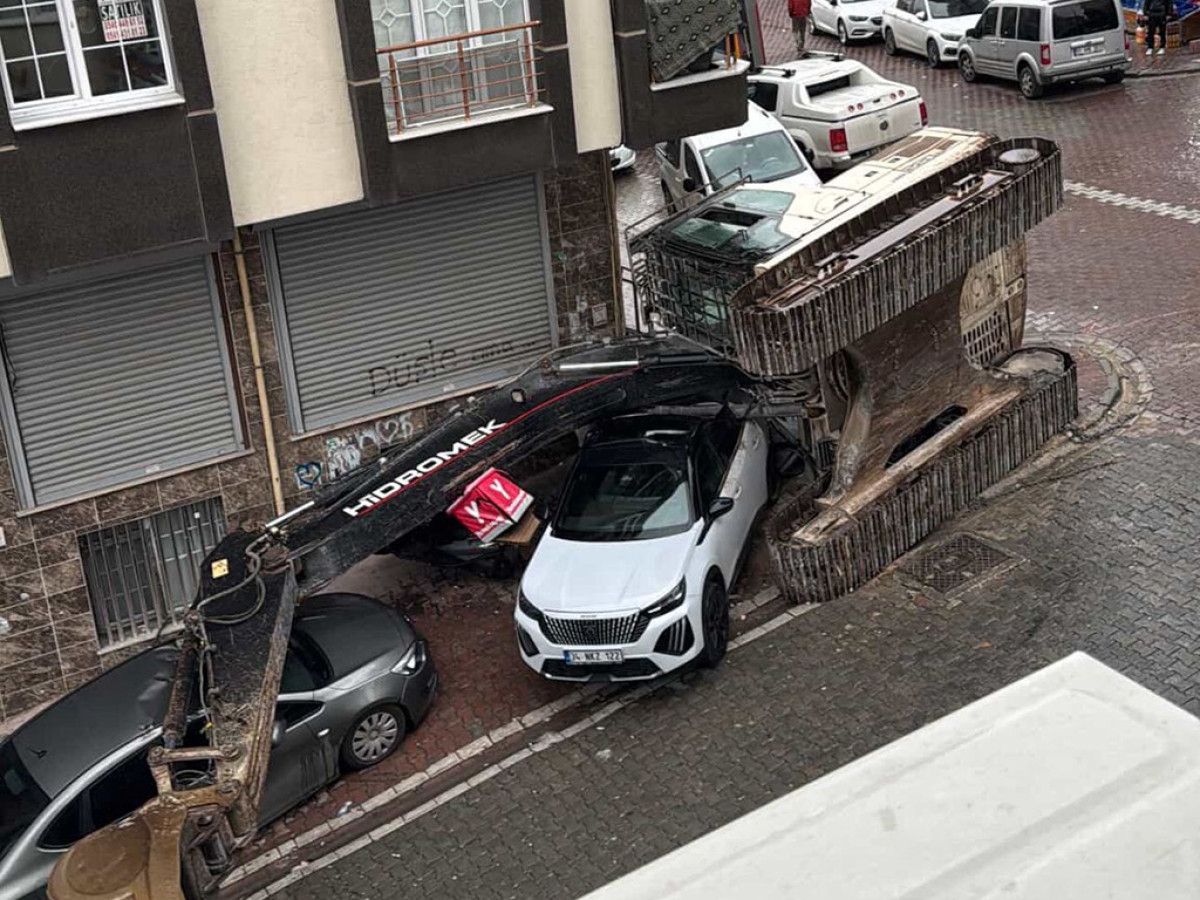 İstanbul Esenyurt’ta iş makinesinin üzerine devrildiği araçlar hasar aldı