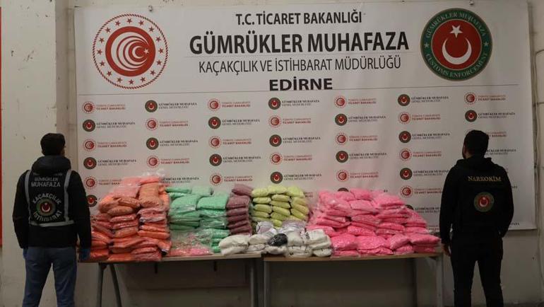 “Edirne, Hamzabeyli ve Sabiha Gökçen Gümrük Muhafaza Kaçakçılık ve İstihbarat birimlerimizce yürütülen operasyonlar neticesinde, 2 milyon 500 bin ecstasy, 170 bin 500 captagon, 74 kilogram esrar, 26 kilogram sentetik uyuşturucu madde ele geçirildi, yakalanan uyuşturucu maddeler imha edildi.”