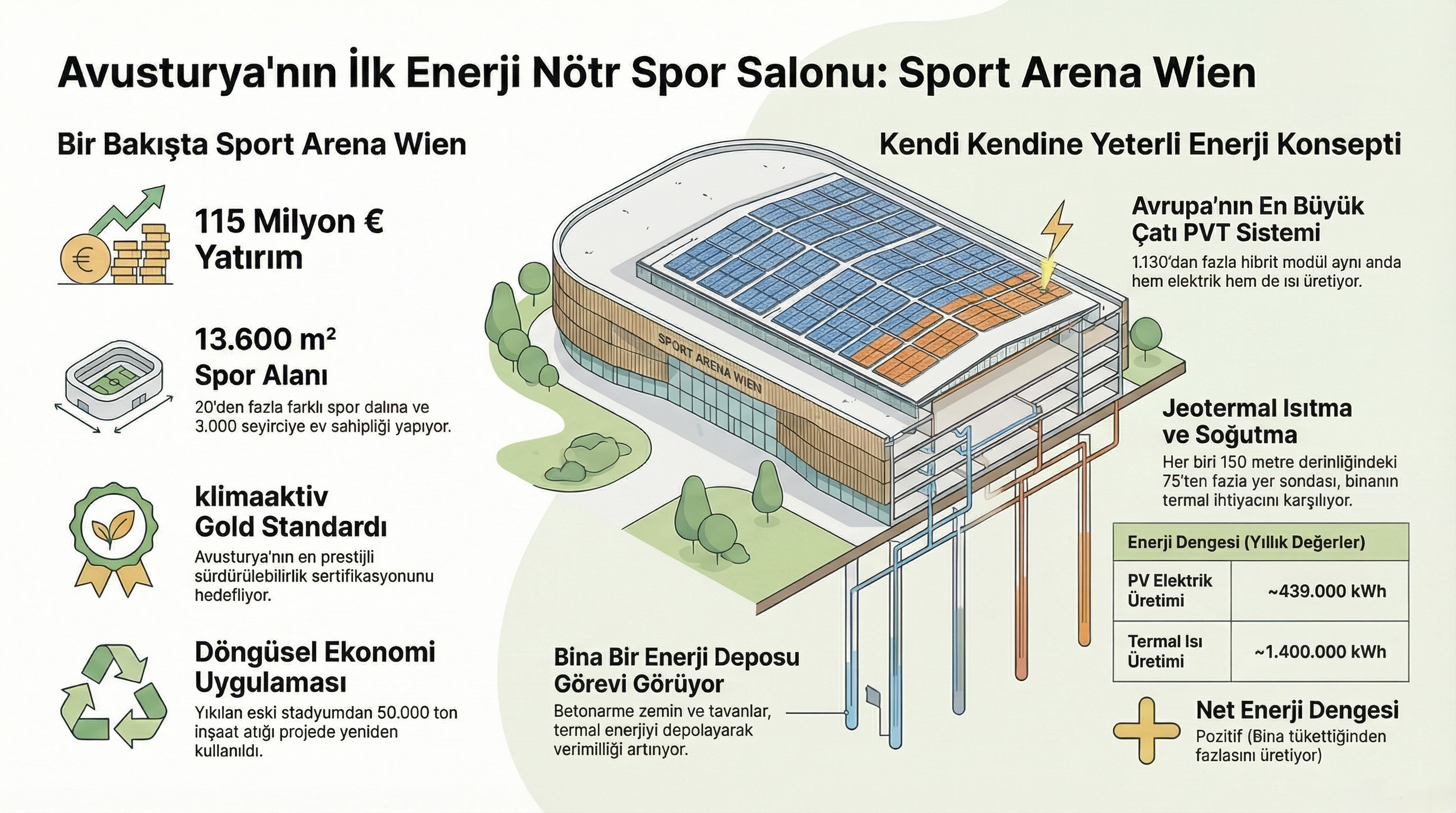 Devasa bir spor kompleksini büyüterek tekrar inşa etmeyi planlayan ve binanın kullandığı enerjiyi kendi kendine üretmesini amaçlayan Viyana, diğer şehirlere de çok örnek olacak bir projeyi hayata geçirdi. Avusturya’nın Viyane kentine kurulan Sport Arena Wien isimli spor kompleksinde toplam 20.000 m2’lik bir alanda toplam 3 farklı kapalı spor salonu bulunuyor, 110 milyon Euro’luk maliyetle hayata geçirilen spor merkezi, birbirinden farklı 20 spor türüne ev sahipliği yapabiliyor ve yıllık 38.000 saatlik kullanım imkanı sunuyor. İhtiyaç duyduğu tüm enerjiyi kendisi üreten bu yapı, Avusturya’nın en prestijli enerji verimliliği derecelendirmelerinden biri olan klimaaktiv Altın sertifikasını almayı başardı.