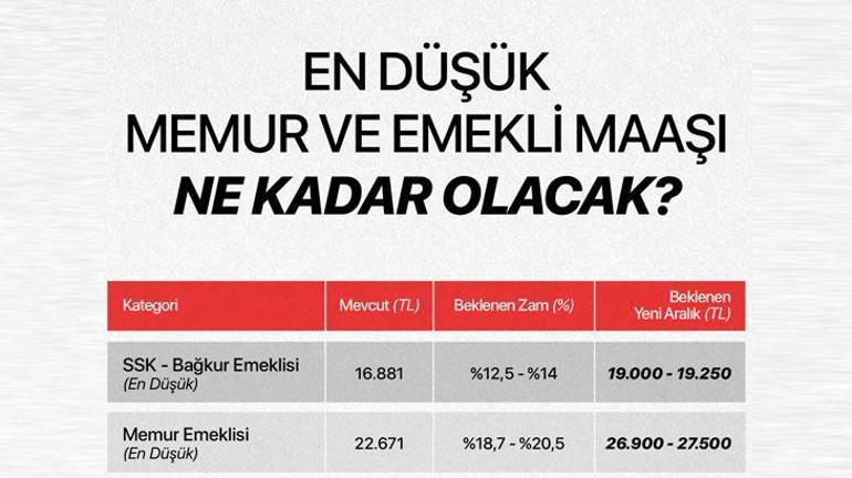 En düşük emekli maaşları daha önceki dönemlerde emeklilere yapılan zam oranında veya biraz üzerinde belirleniyordu. Yine aynı oranda bir düzenleme yapılacağını ve en düşük SSK ve Bağkur emeklisi maaşının 16.881 TL’den yüzde 12,5-14 bandında artarak 19.000-19.250 TL bandına yükseleceğini, en düşük memur emeklisi maaşının da 22.671 TL’den %18,70-20,50 bandında artışla 26.900-27.500 TL seviyelerine yükseleceğini öngörüyoruz. En düşük memur maaşının ise 60.000 ile 61.000 TL bandına yükselmesi bekleniyor.”